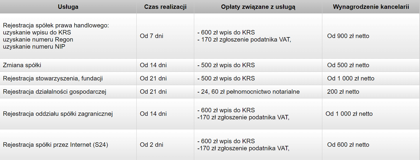 Wszystkie ceny obejmują usługę kompleksową wraz z przygotowaniem treści umowy spółki.